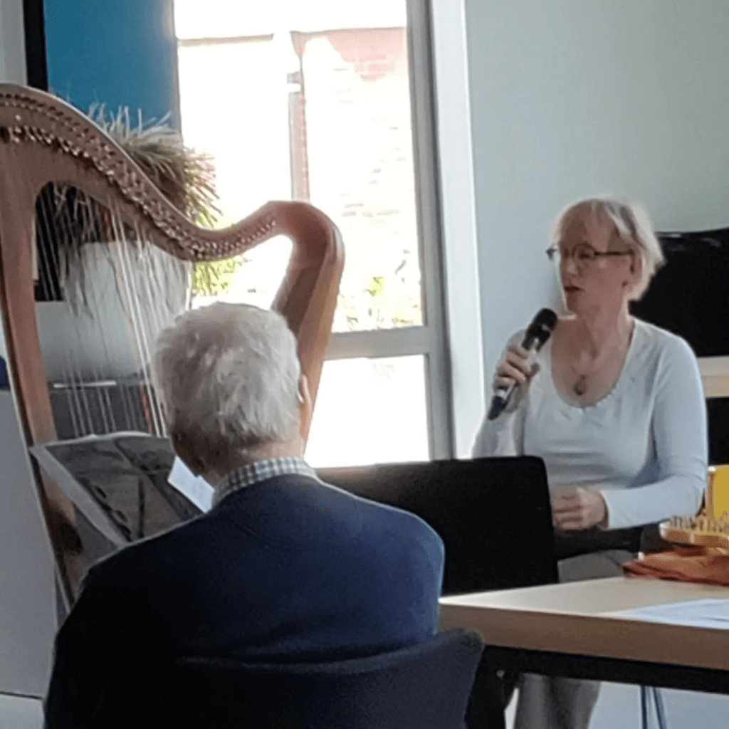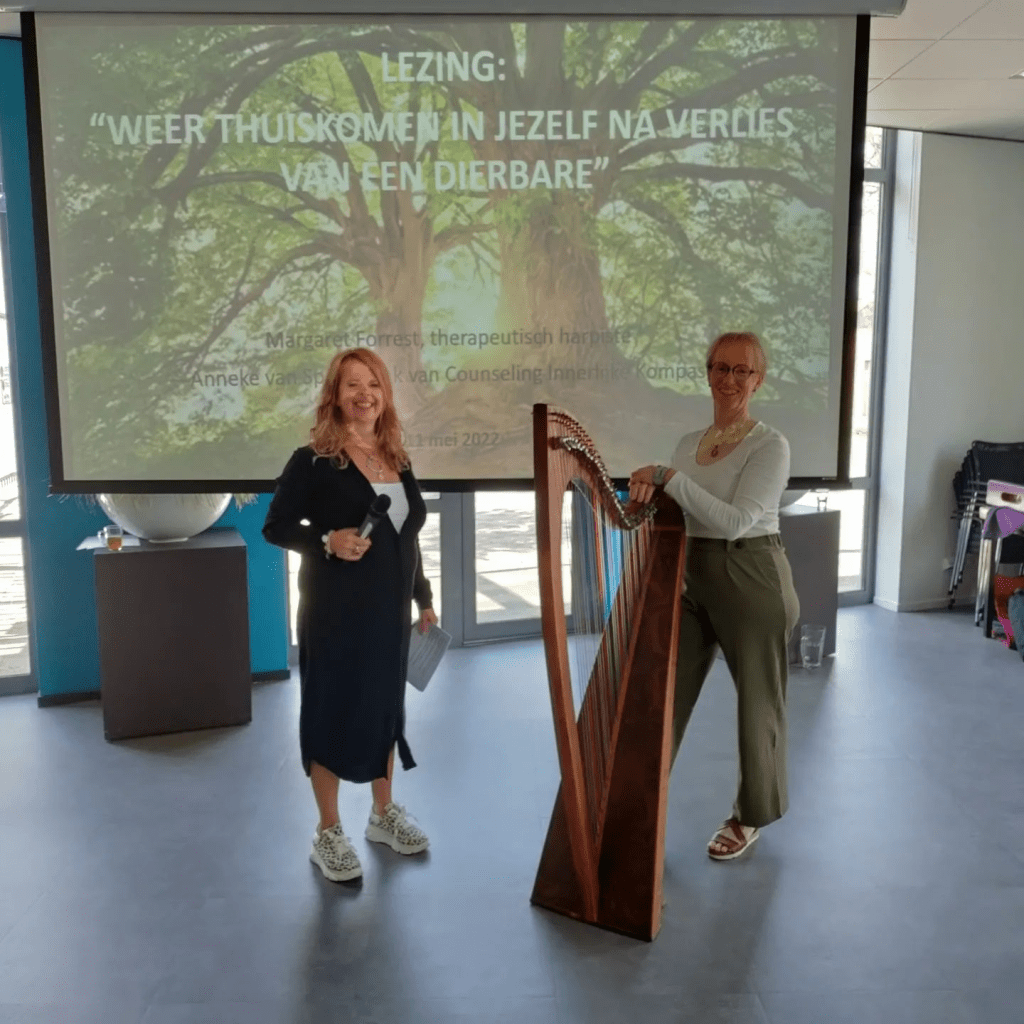 Margaret Forrest (therapeutisch harpiste) verzorgt de intermezzo’s en het actieve gedeelte na de lezing. Ze laat d.m.v. haar harp gevoelens meer doorvoelen zodat je meer in je lichaam komt. Dit kan zeer ondersteunend zijn aan het rouwproces.